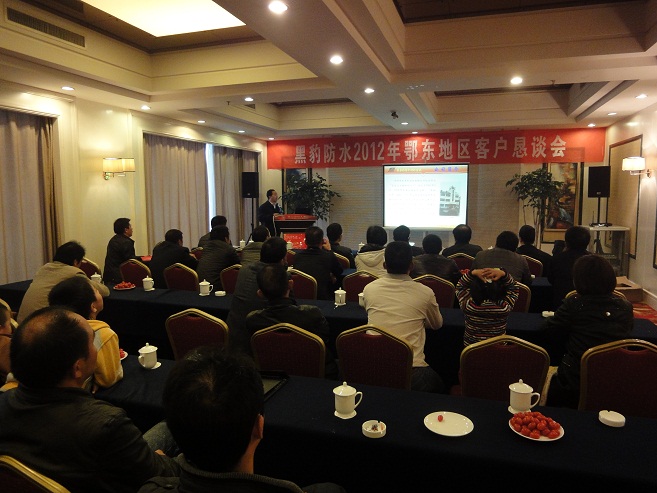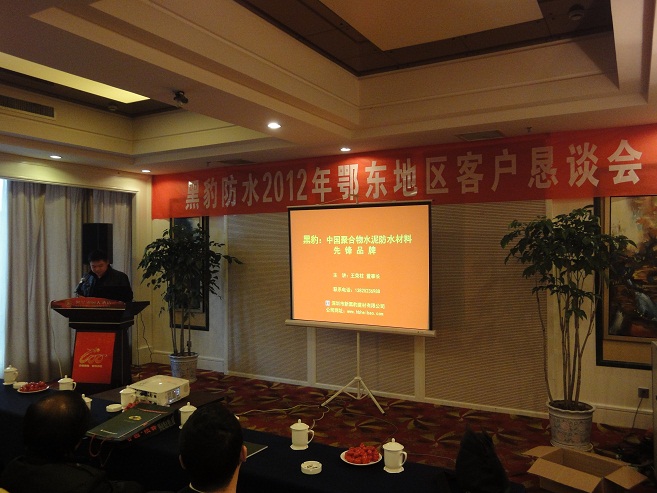 2012年11月10日,深圳市新黑豹建材有限公司在湖北黄梅地区总经销的大力支持下,成功地在黄梅世纪锦园大酒店召开了2012年鄂东地区客户恳谈会。会议由深圳市新黑豹建材有限公司黄梅总经销吴志高总经理主持,我公司董事长王荣柱先生首先介绍了公司目前的发展情况及公司产品的情况。在会上,我公司还通过宣传短片的形式向参会的客户介绍了公司产品的外观特征及防伪查询方法。与会的经销商代表们还观看了深圳电视台关于工商部门查处假冒“黑豹”牌防水涂料的相关报道及《聚合物水泥防水涂料室内防水工程防水施工工艺及质量控制》相关短片。