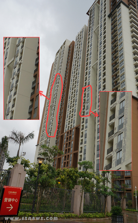7月26日深圳市住建局回应称,6月24日,市质监总站在监督检查中已发现阅景花园的外墙问题,该小区外墙由于抹灰层与饰面层施工工艺过快和雨水影响,导致外墙装饰层开裂,并不涉及房屋结构安全。目前该项目外墙开裂问题正在整改过程中,需要对原装饰层及基层进行铲除、修补。业主现场看到外墙存在补痕及脱落,属该项目整改过程中的正常作业行为。 |