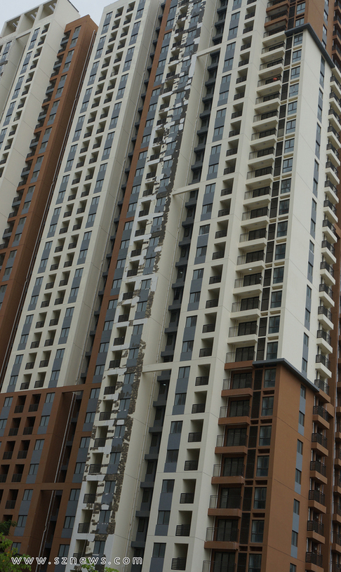 深圳新闻网7月26日讯(记者 王丹丹)安居房项目中海阅景花园存在质量问题?近日,有不少网友在深圳各大论坛反映(点击进入贴文),深圳安居房中海阅景花园项目外墙严重脱落,7月25日记者在现场发现,阅景花园4栋塔楼均存在不同程度的外墙脱落,最严重的部分从一楼到顶楼均有脱落现象。