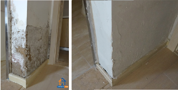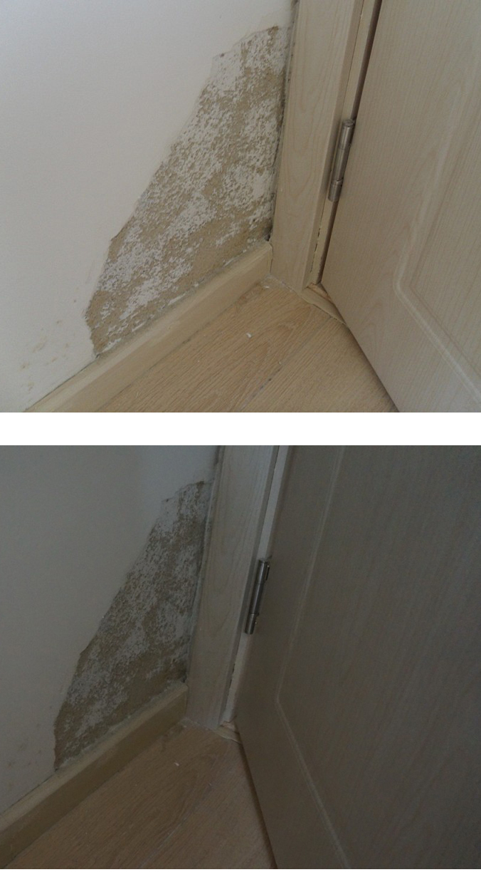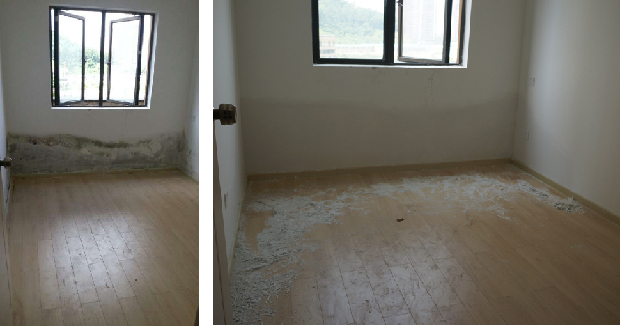 记者在现场看到, 410号房和718号房同样位置,墙壁重新修补粉刷的痕迹明显,2912房间墙角处的剥落仍未修补,2916房未见明显的渗水痕迹。中海相关负责人解释,410号房的墙壁问题,是由于该墙壁外接露台,前期施工中露台与墙壁间存在缝隙导致渗水,718房间的渗水,是因为供水管道接口存在问题;而2912墙角处的剥落,目前尚未查清究竟是供水管道渗水,还是建筑工人用水不当导致墙壁被浸泡。