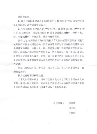 国家工商行政管理总局商标评审委员会认为“黑豹皇”商标指定使用的油漆、沥青清漆等商品与我公司“黑豹”商标指定使用的非金属建筑物材料、涂料(土、砂、石建筑材料)等商品构成类似商品,并依据《商标法》第二十八条、第三十三条、第三十四条的规定,国家工商行政管理总局商标评审委员裁定“黑豹皇”商标不予核准注册。
