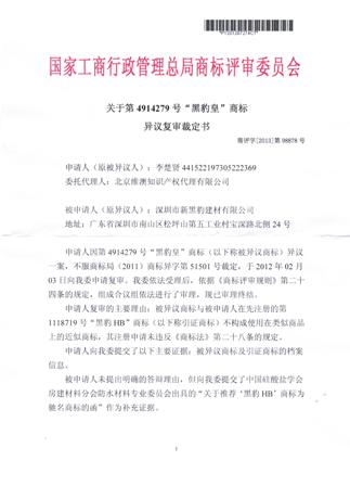 关于“黑豹皇”商标异议裁定书
